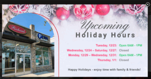 Please check the website, Google listing or Facebook for special Holiday hours. We are CLOSED ALL SATURDAYS from Thanksgiving weekend through the 1st weekend of January.