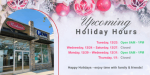 Please check the website, Google listing or Facebook for special Holiday hours. We are CLOSED ALL SATURDAYS from Thanksgiving weekend through the 1st weekend of January.